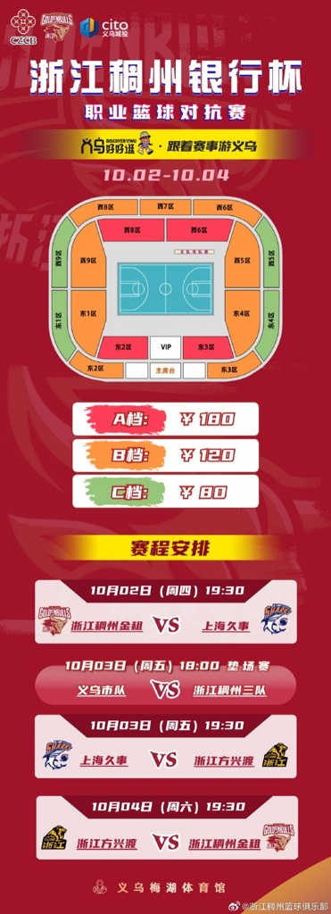 义乌好好逛·跟着赛事游义乌-“浙江稠州银行杯”职业篮球对抗赛将于2025年10月2日-4日在义乌梅湖体育馆举行。在欢度国庆,喜迎中秋佳节之际,浙江稠州金租男篮将携手@浙江广厦篮球俱乐部 、@上海久事大鲨鱼官方微博 展开精彩较量。这也是三支球队在经过新赛季注册期人员调整后的首次亮相。