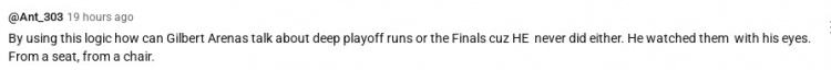 值得一提的是,有网友留言:“照你这个逻辑,阿里纳斯你没进过几次季后赛,也没什么成绩,你也不能谈论那些季后赛末段的比赛对吗?你也不能讨论总决了是吗?你不也是在椅子上看别人打得吗?”
