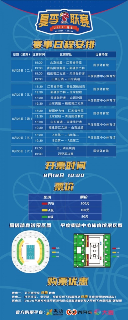 CBA夏季联赛青岛站的具体安排今天在2025年青岛篮球季启动仪式上正式公布!小组赛分为A、B组,A组的新疆、青岛、北控、江苏分在青岛国信体育馆;B组的山西、山东、天津和福建则在平度奥体中心体育馆。赛程为5天(8月26日至8月30日),每个场馆每天2场比赛,所有白天场次门票打八折。