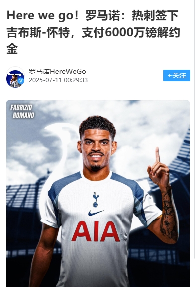 此前,罗马诺曾用Here we go确认,热刺将支付6000万镑的解约金,从诺丁汉森林签下怀特。